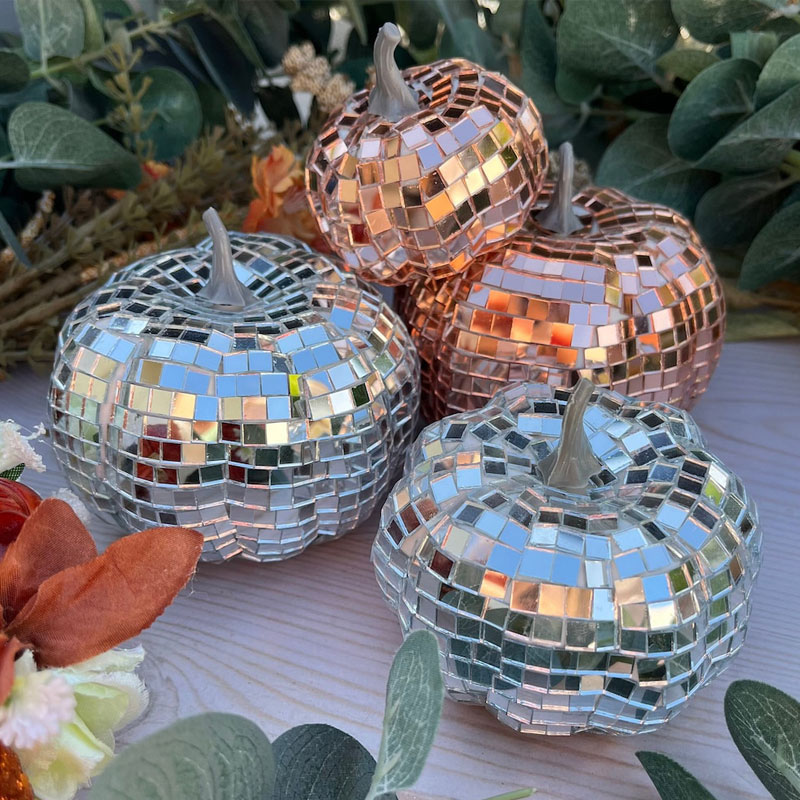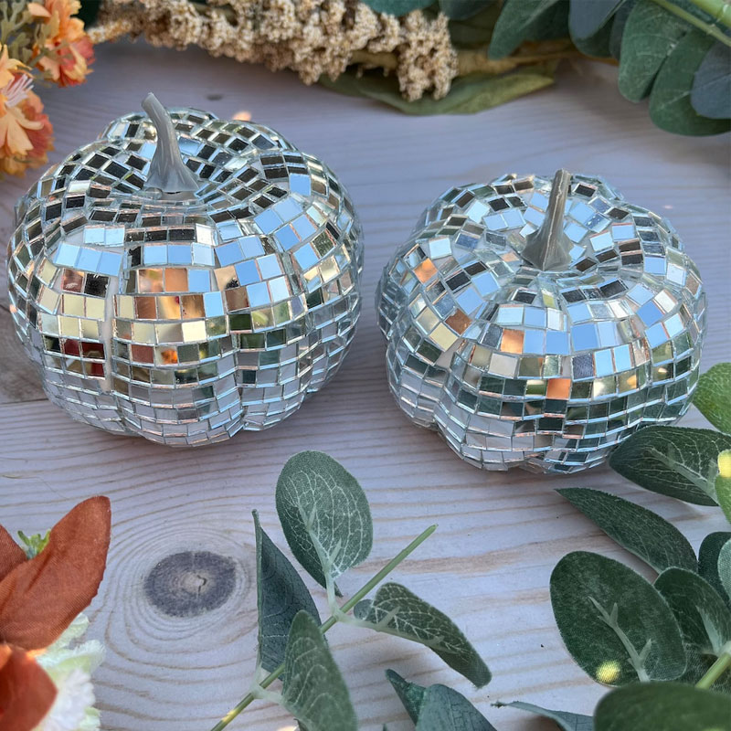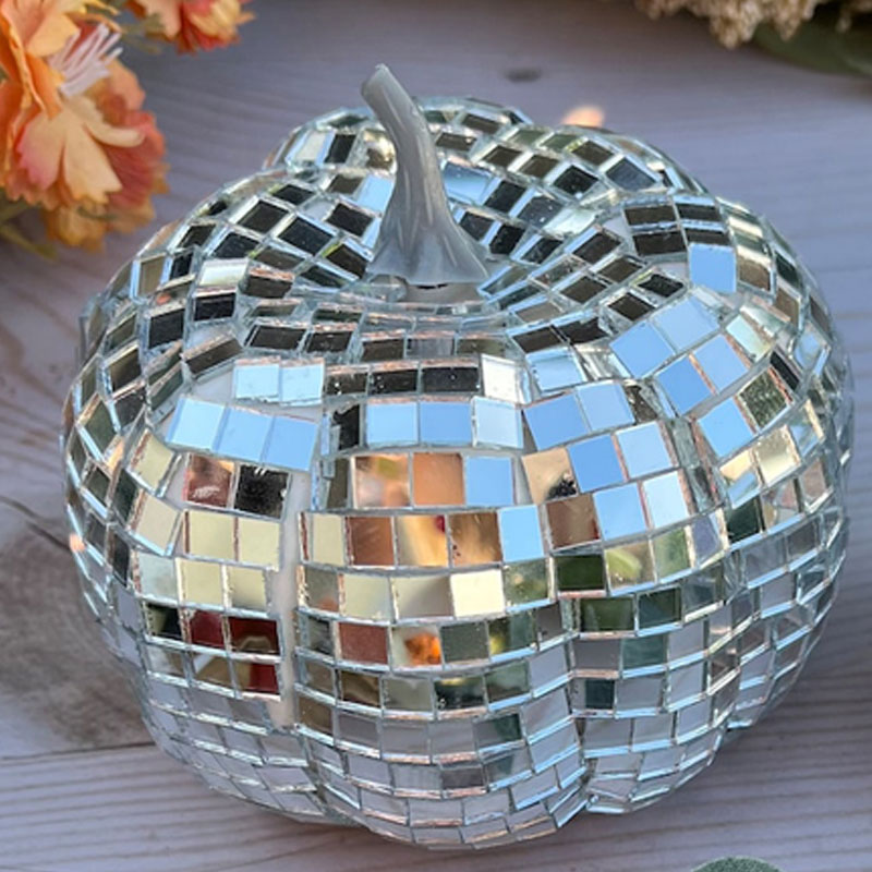 Carefully crafted each pumpkin-shaped ball features an array of reflective mirrors each individually placed on by hand.