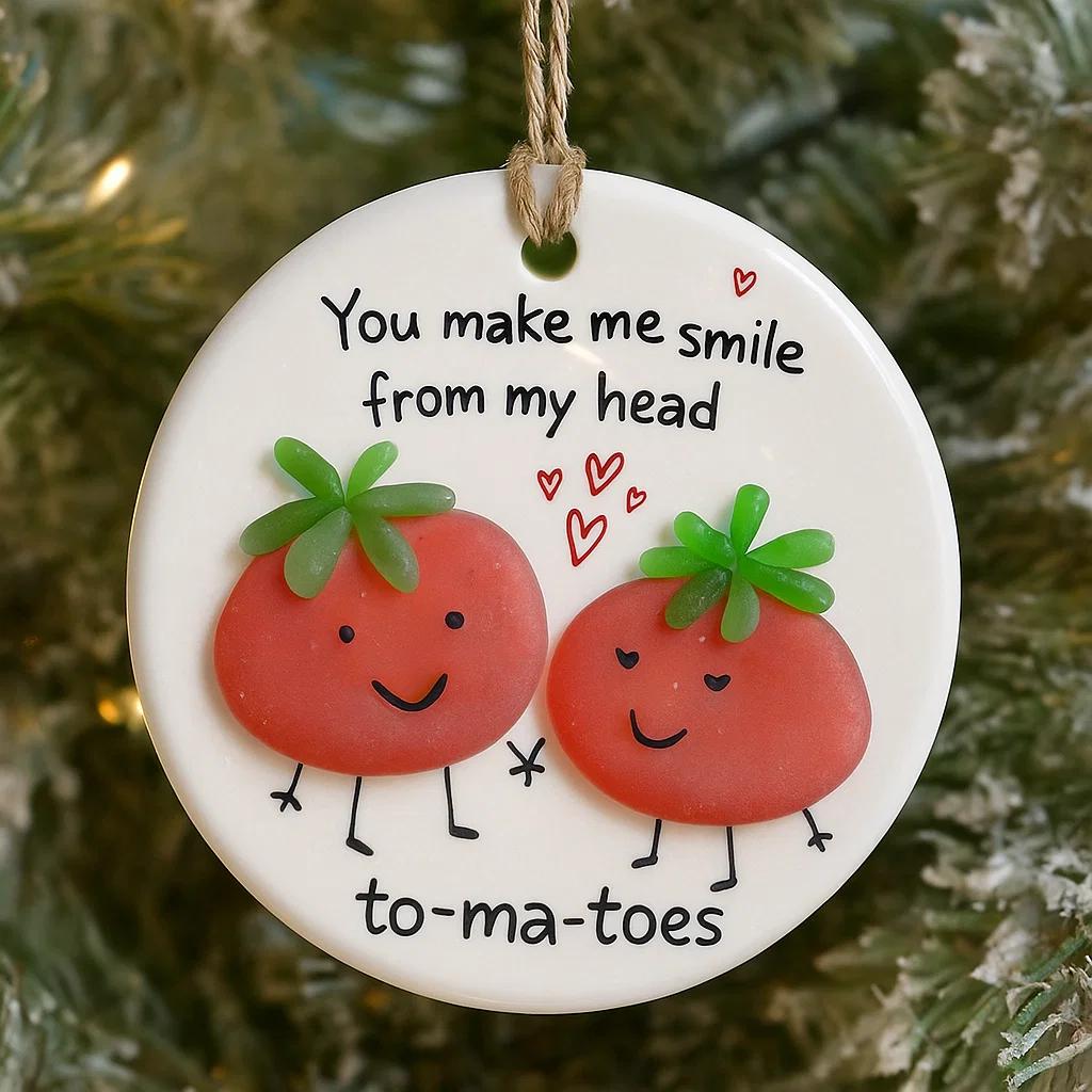 Spread pun-tastic cheer with this adorable duo! Our smiling tomatoes hold hands beneath tiny hearts, paired with the playful message: “You make me smile from my head to-ma-toes.